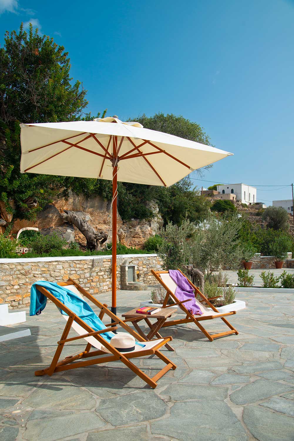 Αυλή με ξαπλώστρες στο Art Houses Sifnos
