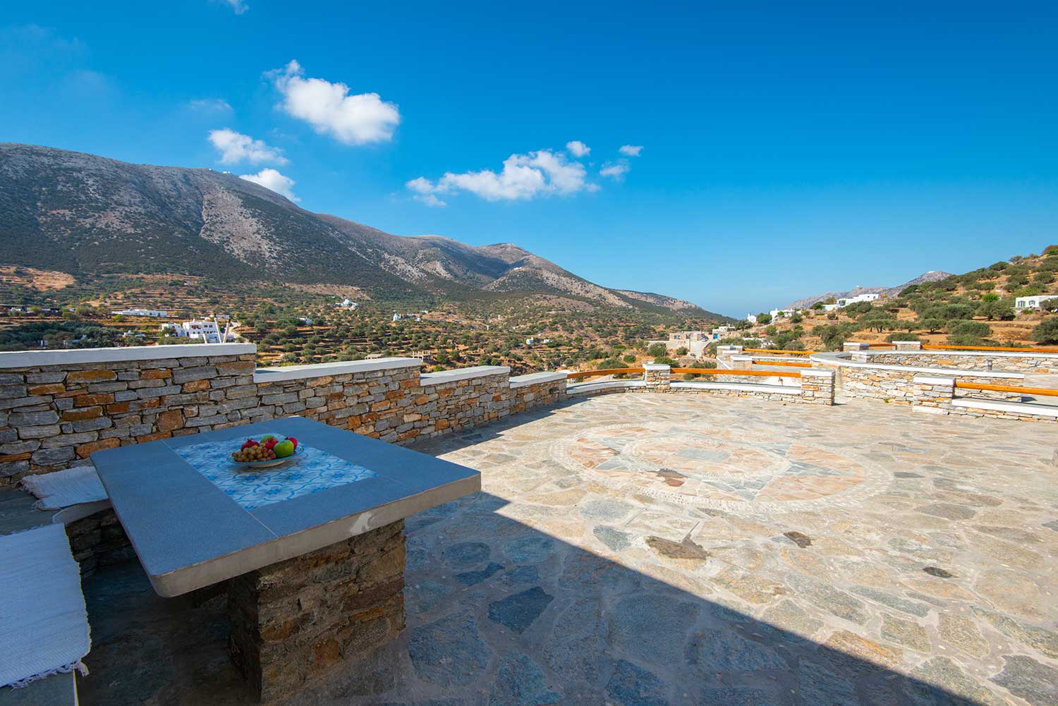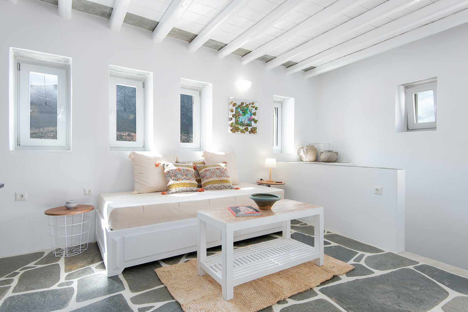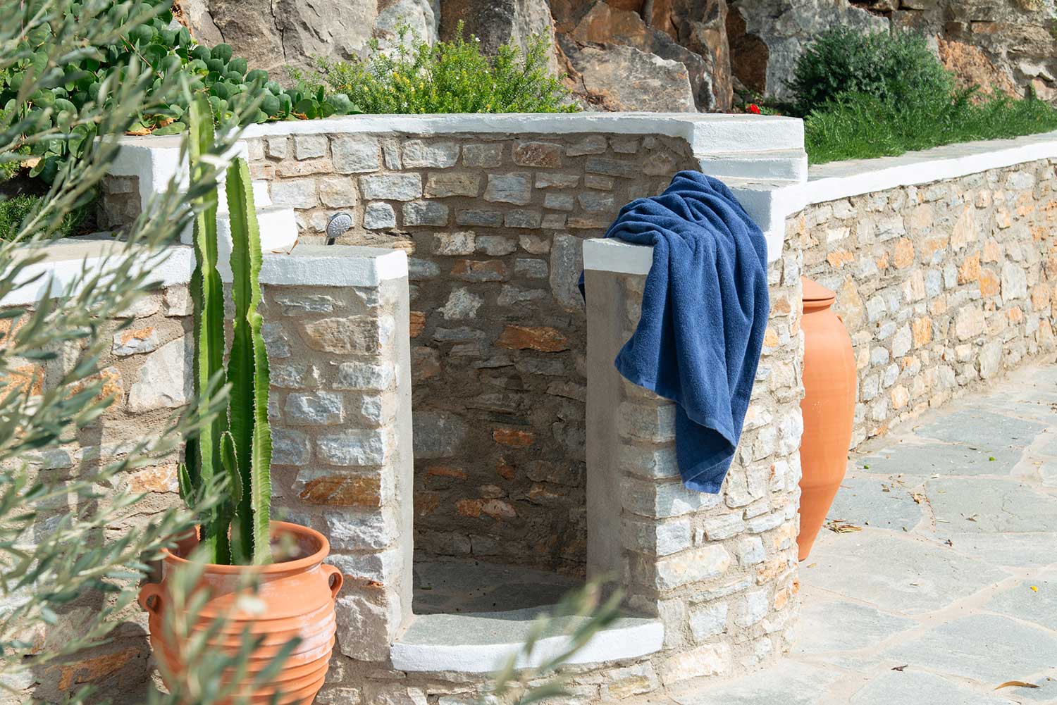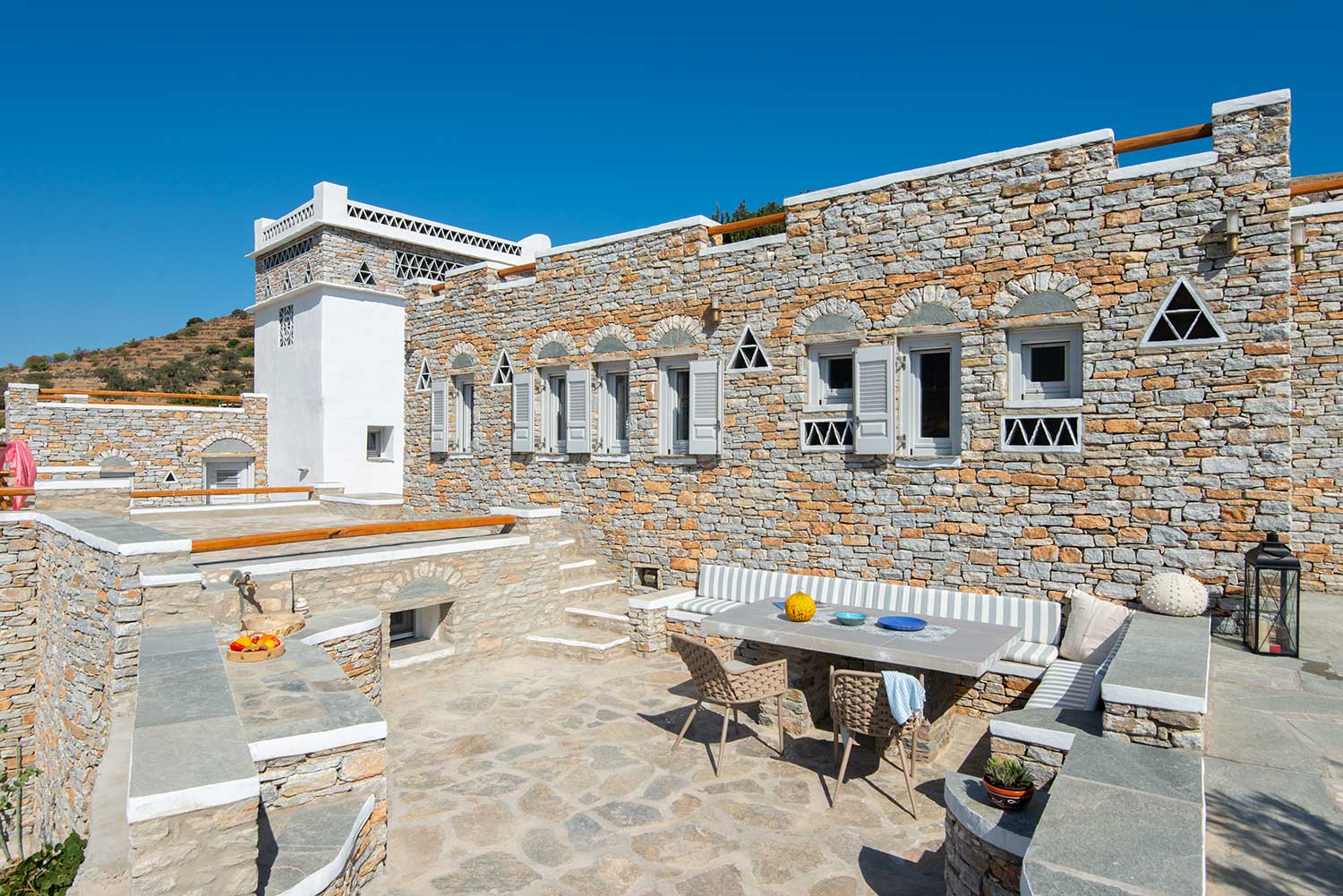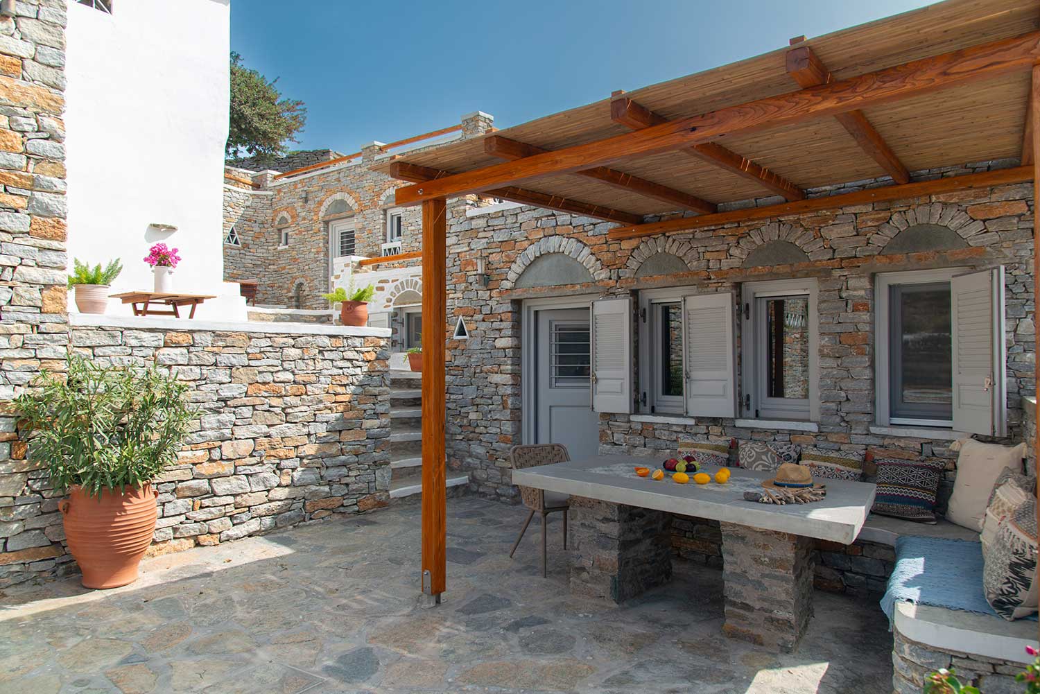 Στο εξωτερικό, μεγάλες αυλές λουσμένες από το φως του Αιγαίου, με έπιπλα εξωτερικού χώρου, ένα μεγάλο πέτρινο τραπέζι και ξαπλώστρες προσφέρουν ιδανικές γωνιές για χαλάρωση με θέα στον ορίζοντα.