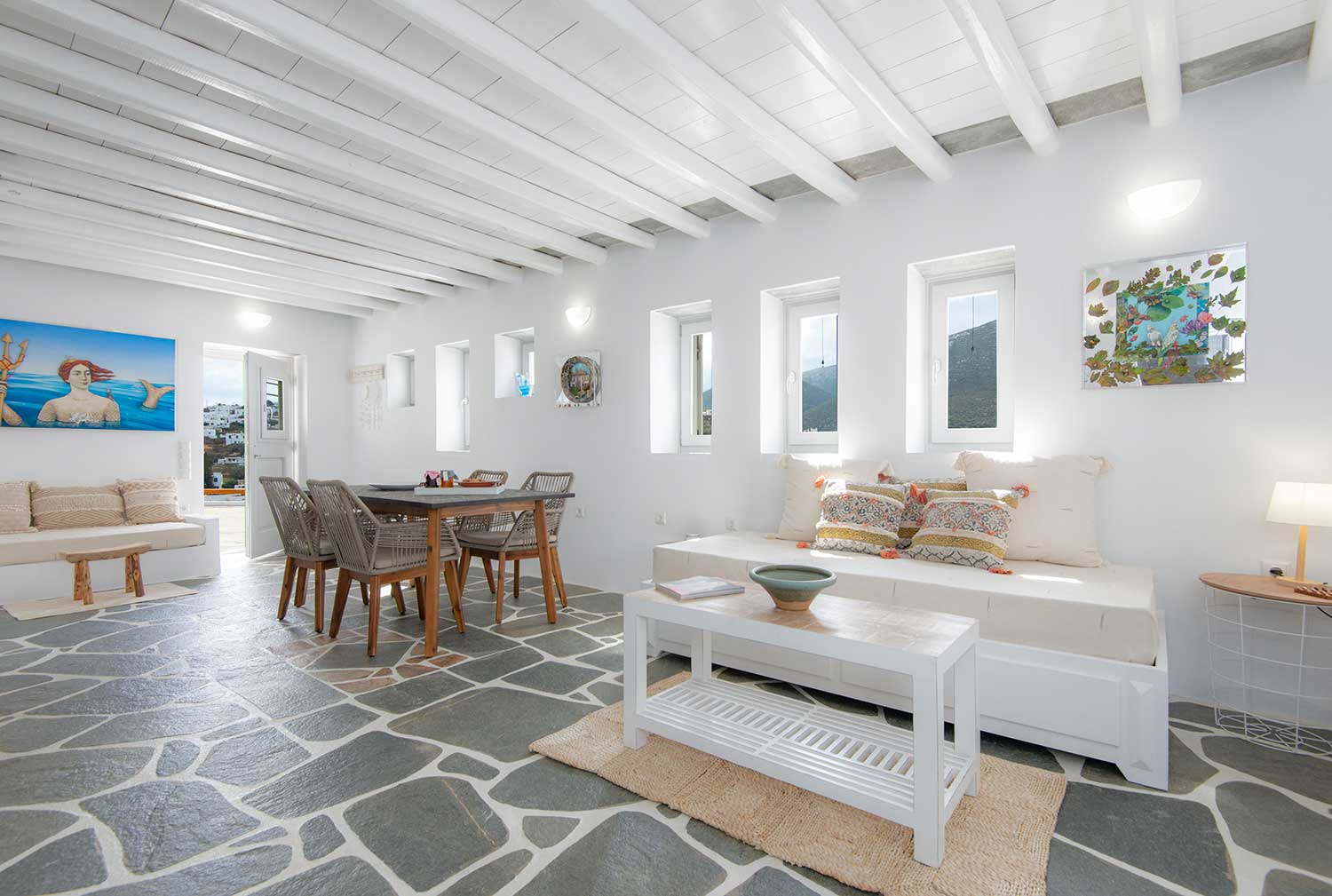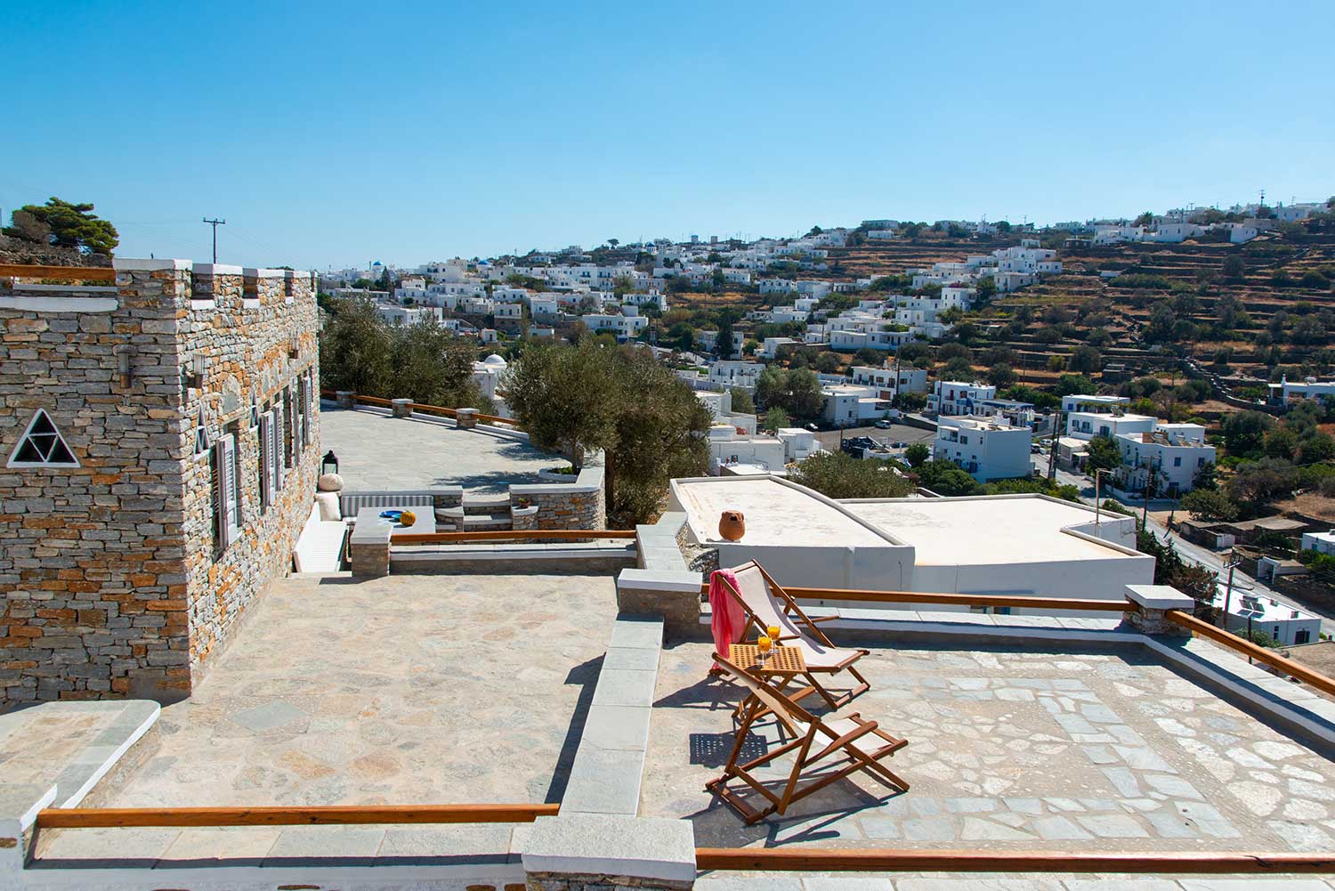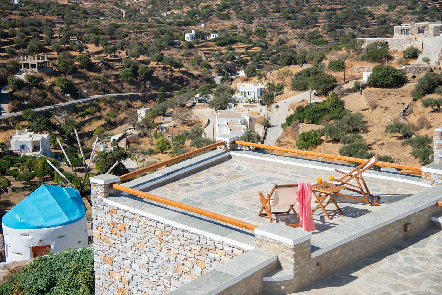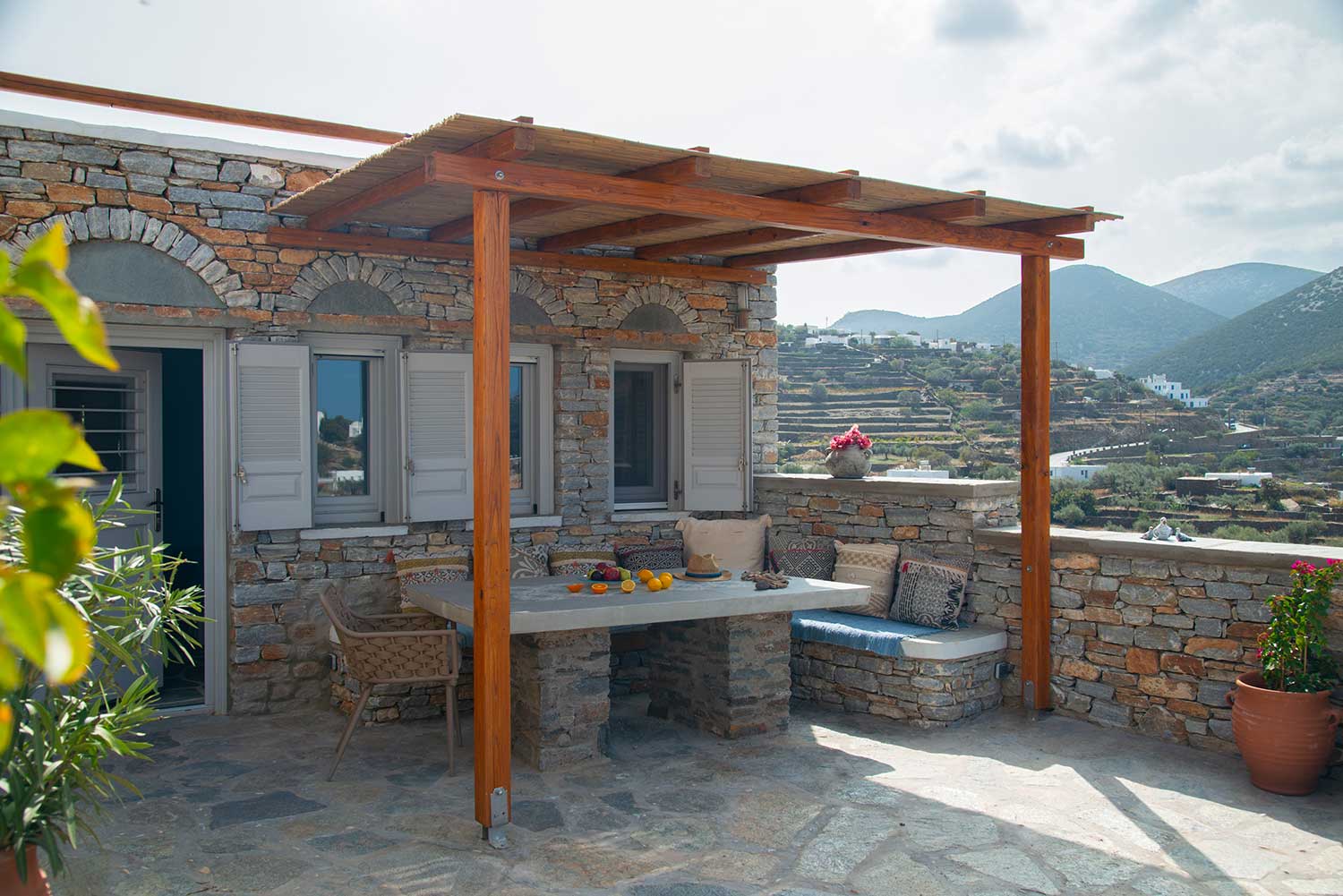 Στο εξωτερικό, μεγάλες αυλές λουσμένες από το φως του Αιγαίου, με έπιπλα εξωτερικού χώρου, ένα μεγάλο πέτρινο τραπέζι και ξαπλώστρες προσφέρουν ιδανικές γωνιές για χαλάρωση με θέα στον ορίζοντα.
