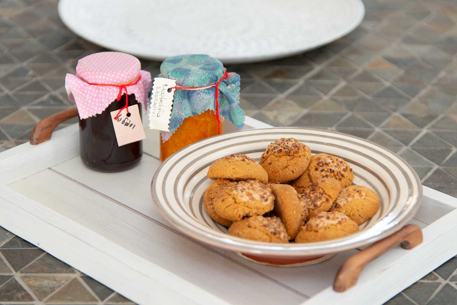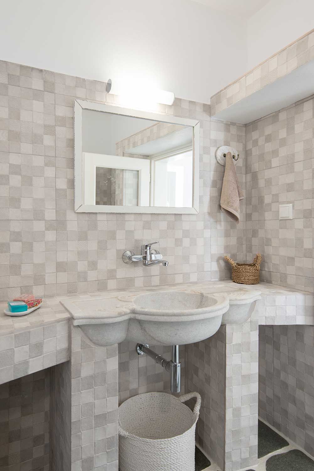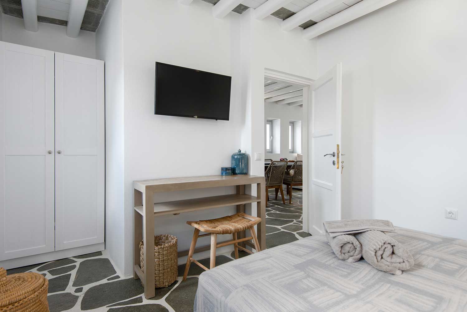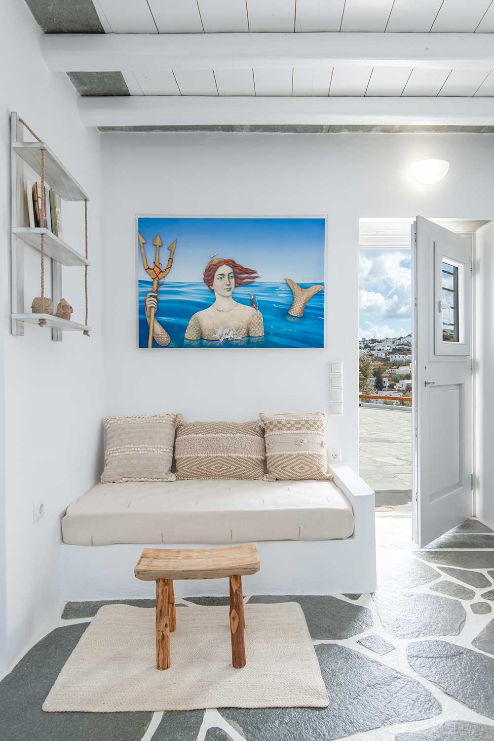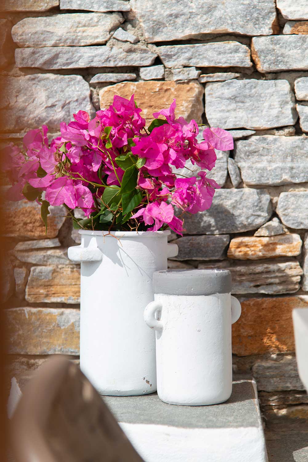 Στο εξωτερικό, μεγάλες αυλές λουσμένες από το φως του Αιγαίου, με έπιπλα εξωτερικού χώρου, ένα μεγάλο πέτρινο τραπέζι και ξαπλώστρες προσφέρουν ιδανικές γωνιές για χαλάρωση με θέα στον ορίζοντα.